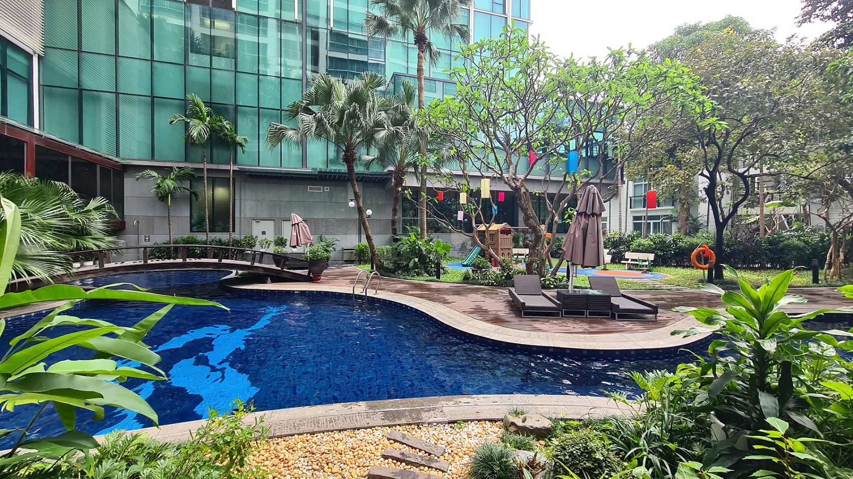 ジム、サウナ、キッズルーム、プール、日本食レストラン、ルーフトップバー等充実の施設内容です。